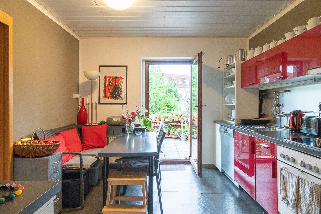 Die Erdgeschosswohnung verfügt über eine Wohnfläche von ca. 77 m² und umfasst ein gemütliches Wohn- und Esszimmer mit direktem Zugang zur großzügigen Wohnküche, ein Schlafzimmer sowie ein weiteres kleines Zimmer, das flexibel als Kinder-, Arbeits- oder Gästezimmer genutzt werden kann. Ein praktisches Tageslichtbad mit Dusche rundet das Raumangebot ab. Der Zugang erfolgt entweder über den gemeinsamen Hauseingang an der Straßenseite oder über einen separaten Eingang vom Hof aus. Dort befindet sich auch die sonnige Terrasse mit Blick ins Grüne – ein schöner Rückzugsort für entspannte Stunden im Freien.